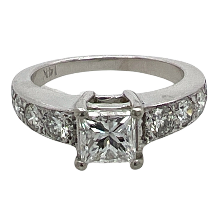 Princess cut diamond engagement ring fashioned in 14 karat white gold. The GIA certified princess cut diamond weighs 1.01 carat and is graded E color and VVS2 clarity. Round brilliant cut diamonds are channel set in the band and weigh approximately .70 carat total weight. The ring is currently size 5.5 (can be sized).
