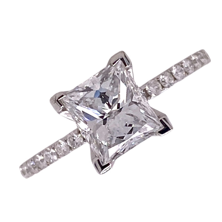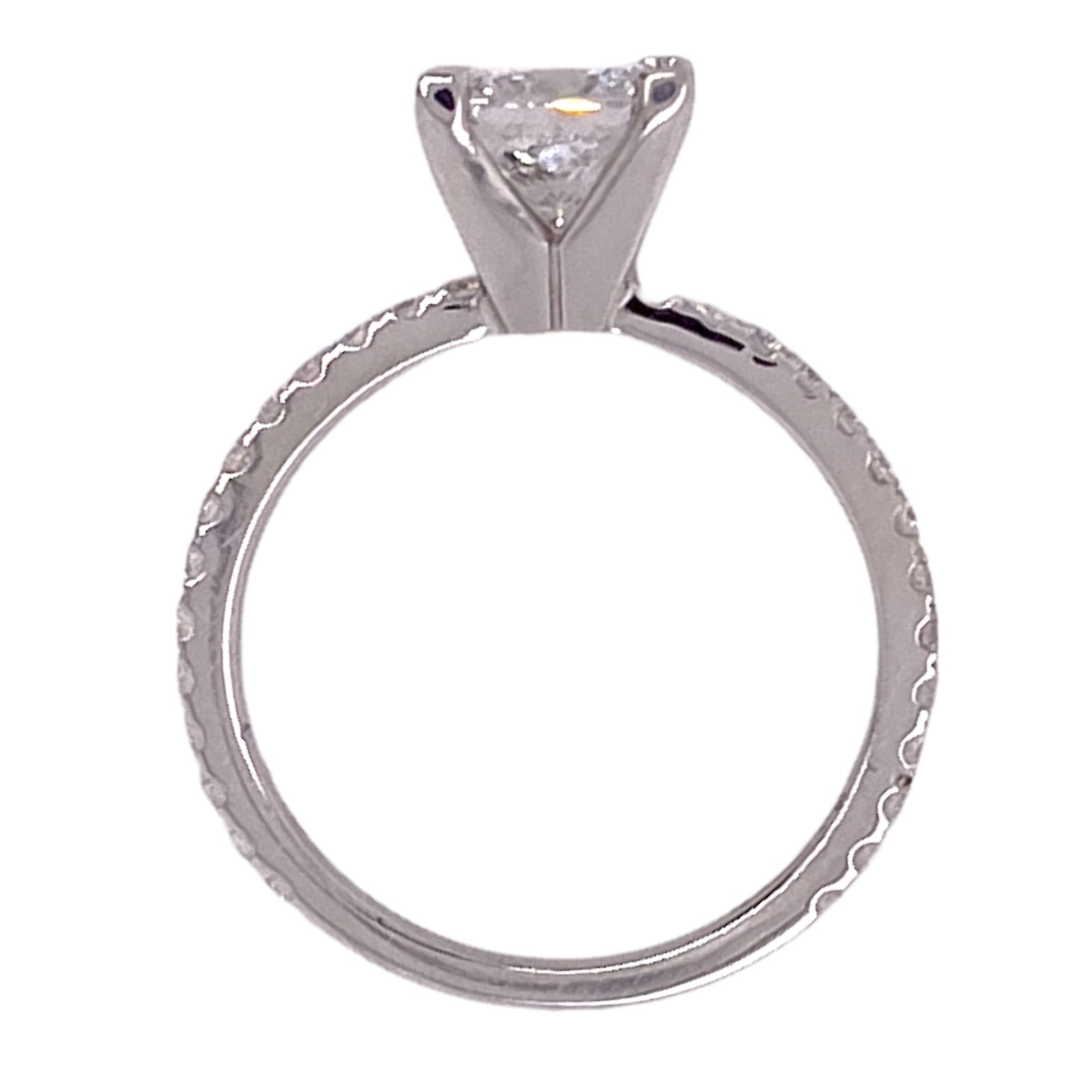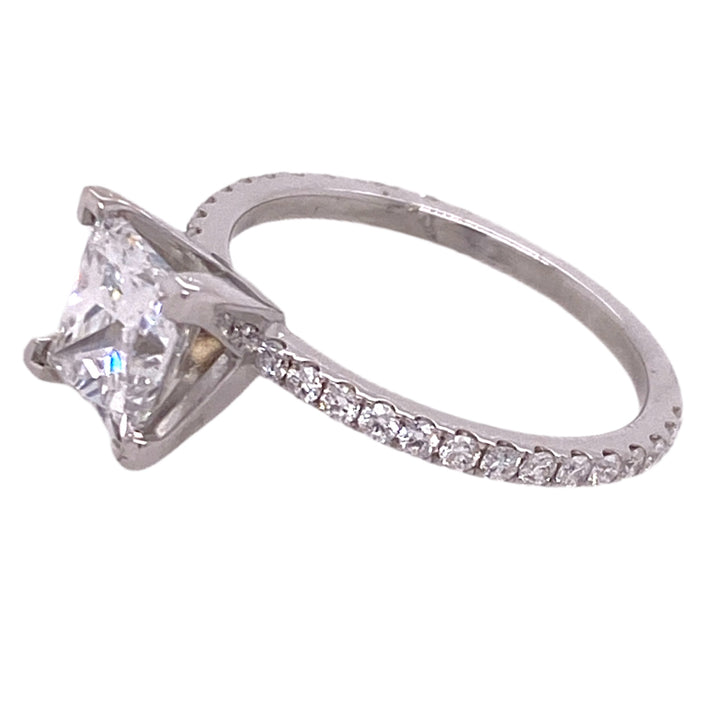Radiant Diamond engagement ring fashioned in 18 karat white gold. The 1.54 carat radiant cut diamond is GIA certified D color and VVS1 clarity. The thin minimalist diamond mounting features another .50 carat total weight of high quality white diamonds. The ring is currently size 6.5 (can be sized).