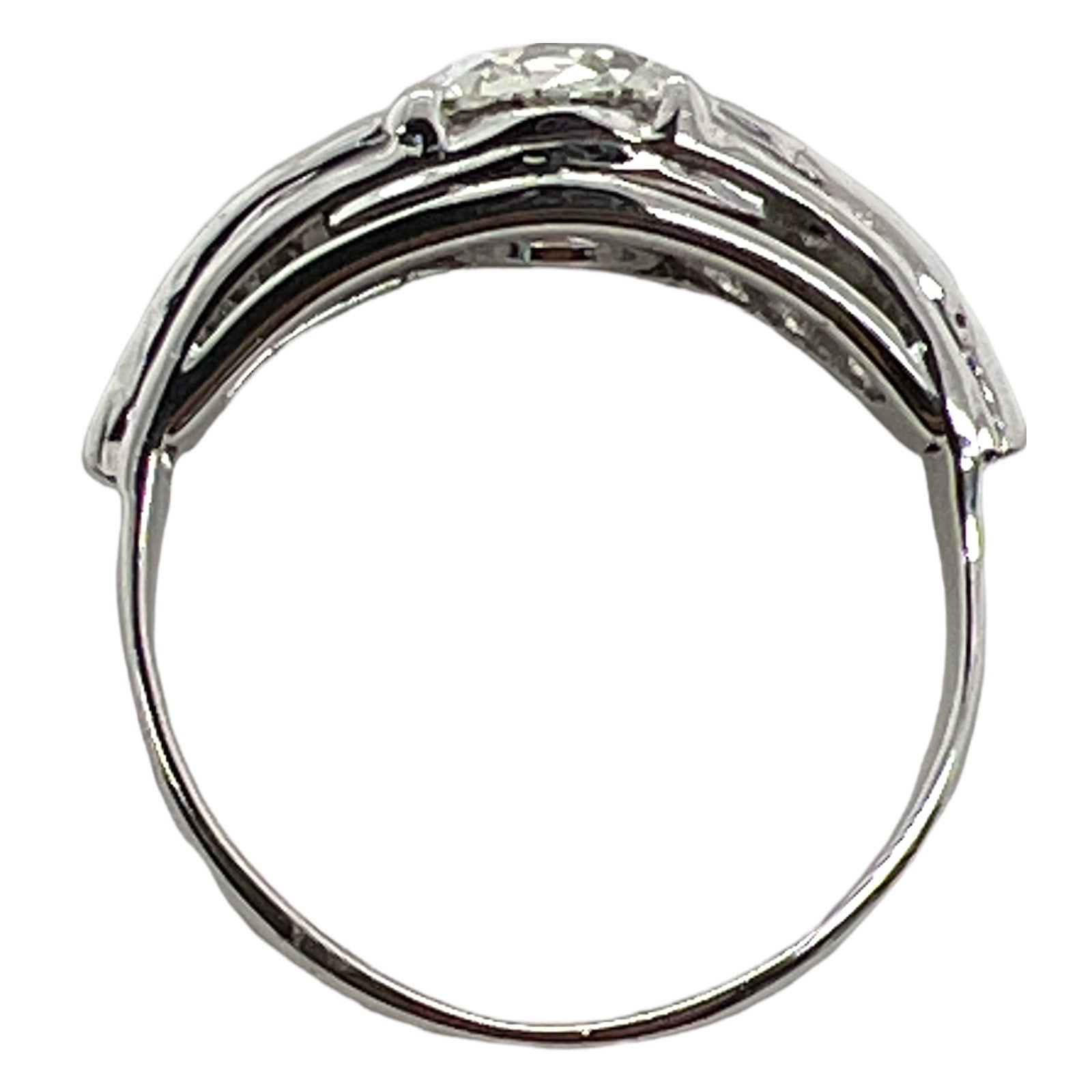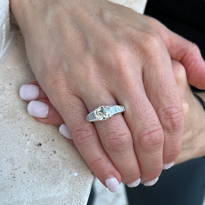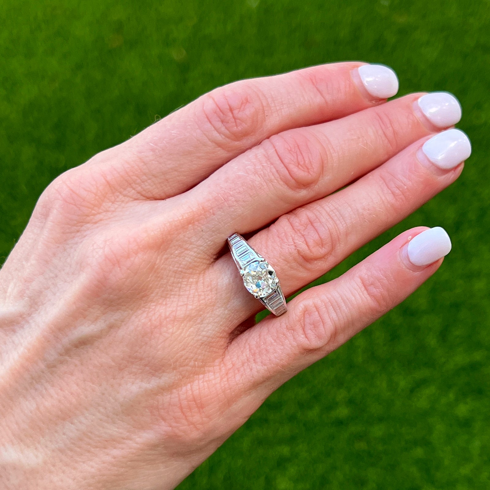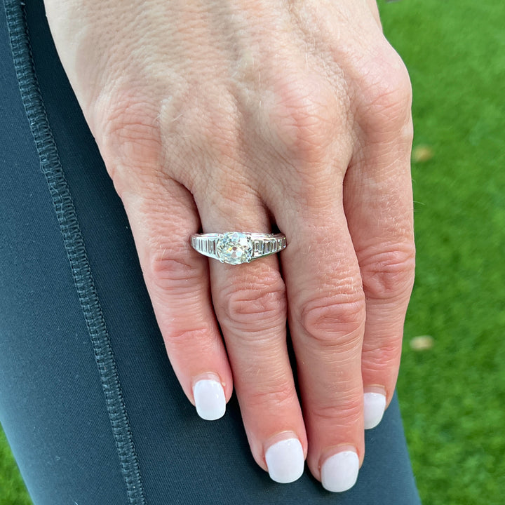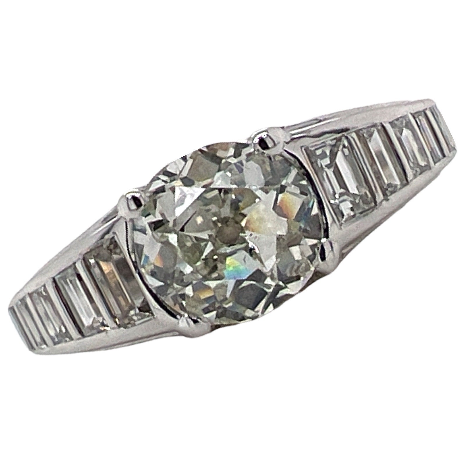 Estate diamond engagement ring crafted in platinum. The ring features an approximately 1.67 carat Old European cut diamond graded J-K color and SI clarity. The platinum mounting is set with 10 baguette diamonds weighing approximately .60 CTW. The ring is currently size 7.5 (can be sized), amd measures 7.5 x 22mm on top.