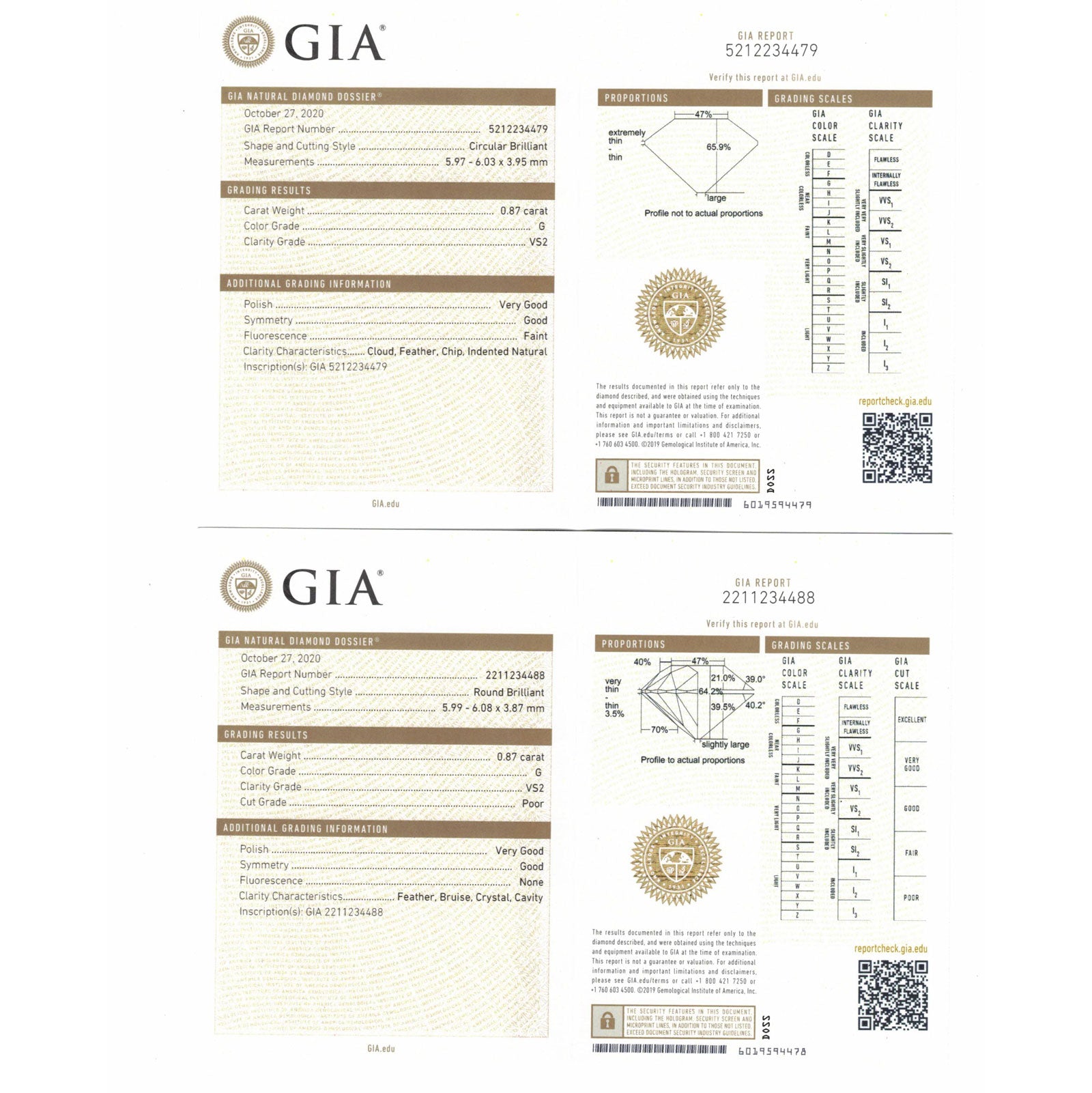 Round brilliant diamond stud earrings set in 14 karat white gold martini mountings. The 2 round brilliant cut diamonds weigh 1.74 carat total weight and are graded by the GIA G color and VS2 clarity. Please see the certificates below in the photos.