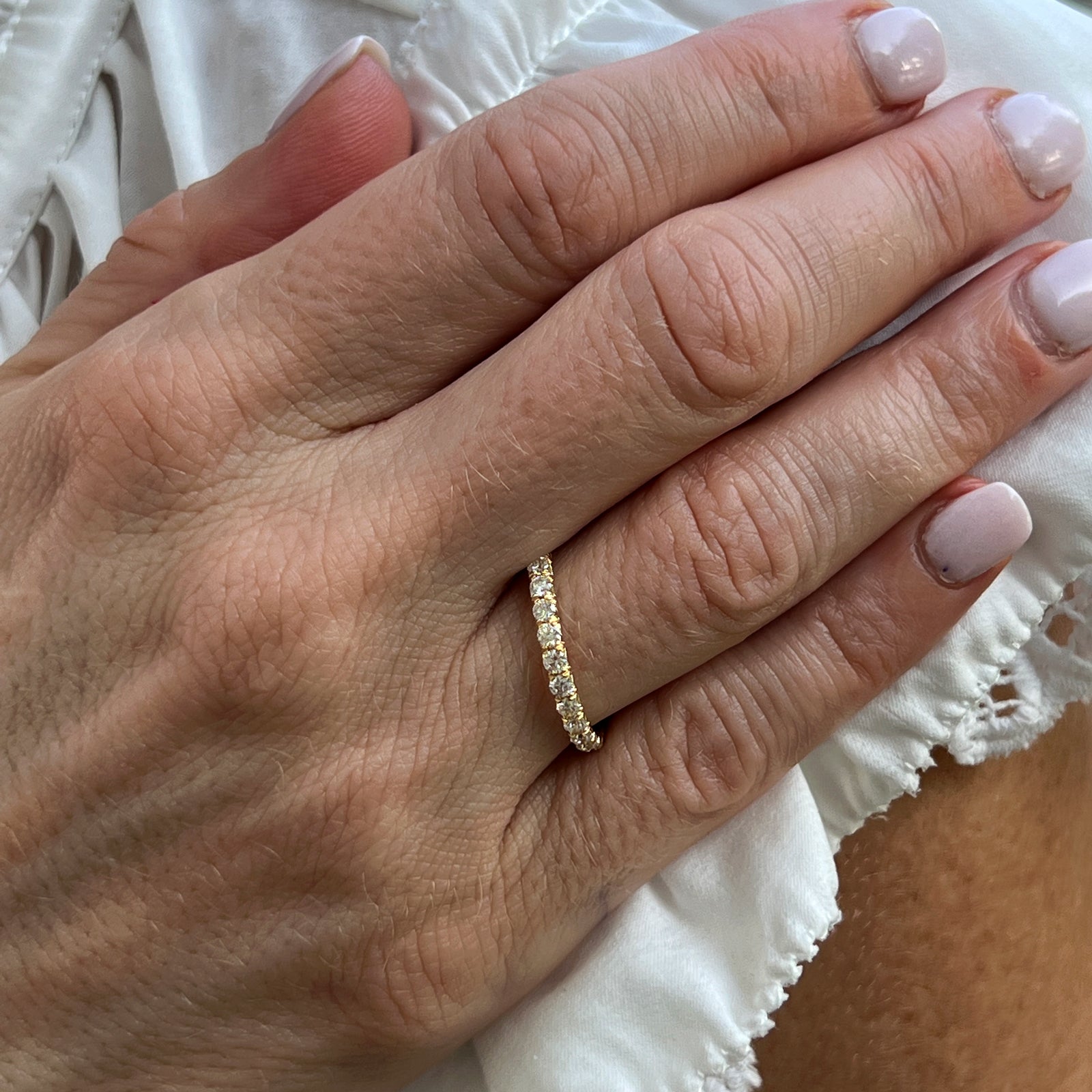 Diamond eternity band fashioned in 18 karat yellow gold . The band features round brilliant cut diamonds weighing 1.85 CTW and graded G-H color and SI clarity. The band is size 7 and measures 2.7 mm in width.