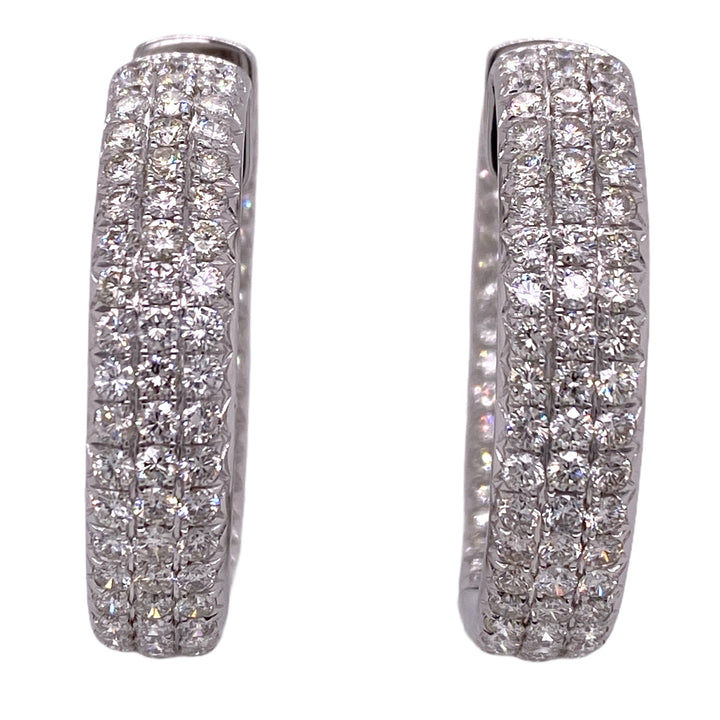 Stunning wide in & out diamond hoop earrings crafted in 18 karat white gold. The three rows feature 252 round brilliant cut diamonds weighing 10.65 carat total weight and graded F-G color and VS clarity. The hoops measure .30 inches in width, and 1.50 inches in diameter.