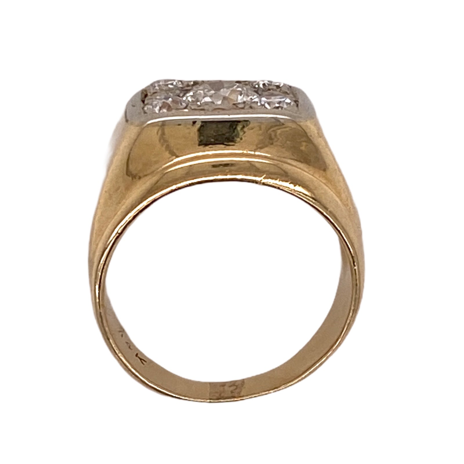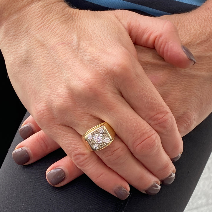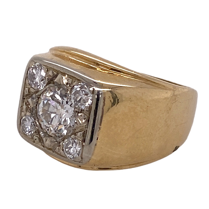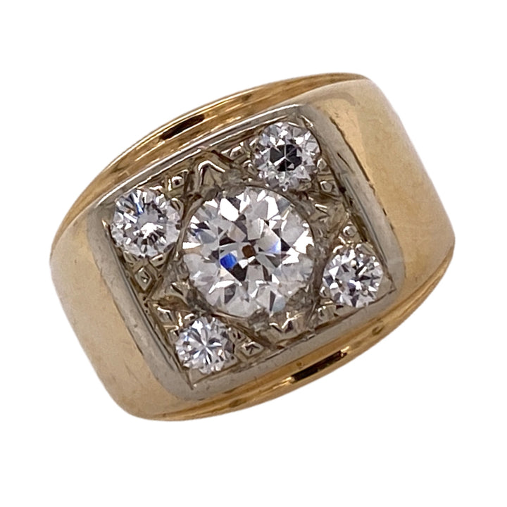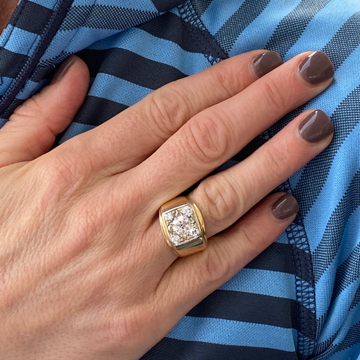 Vintage Old European cut diamond ring fashioned in 14 karat yellow gold. The ring features an Old European cut center diamond weighing .95 carats and another 4 surrounding diamonds weighing ,40 carat total weight. The diamonds are graded G-H color and SI clarity. The square top measures 15 x 15mm, and the ring is currently size 6.5 (can be sized).