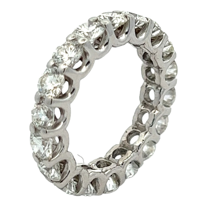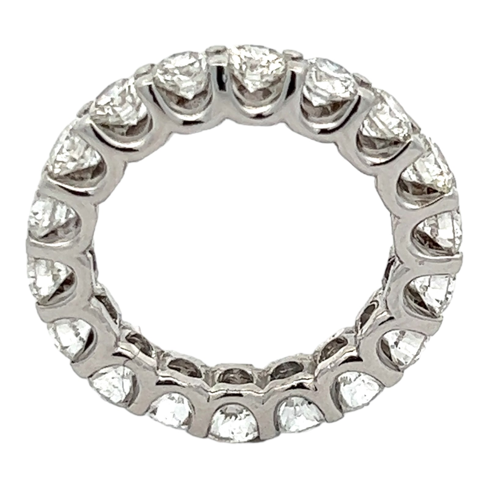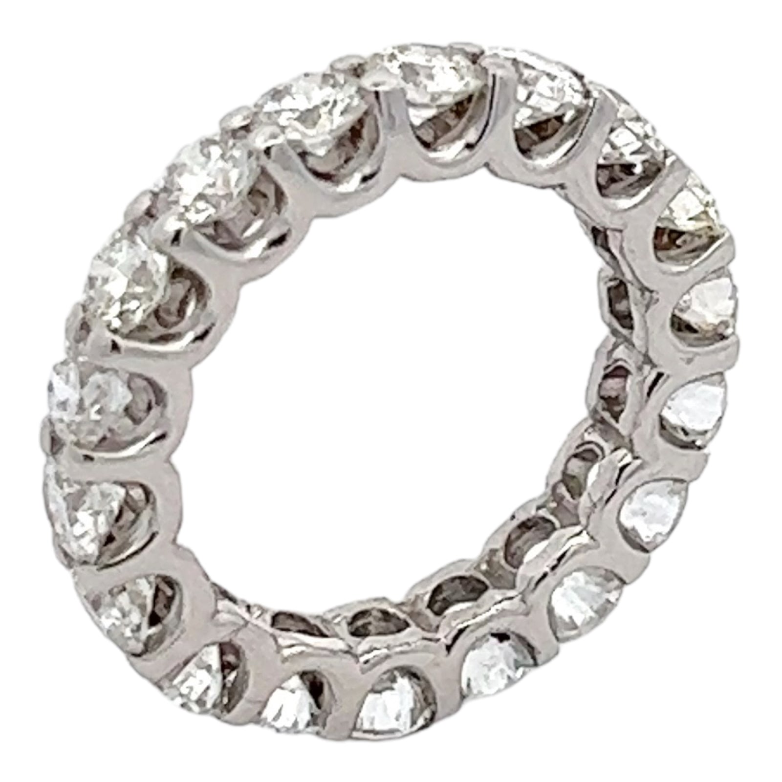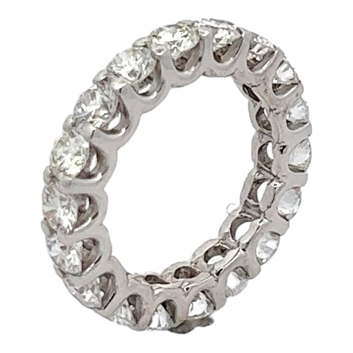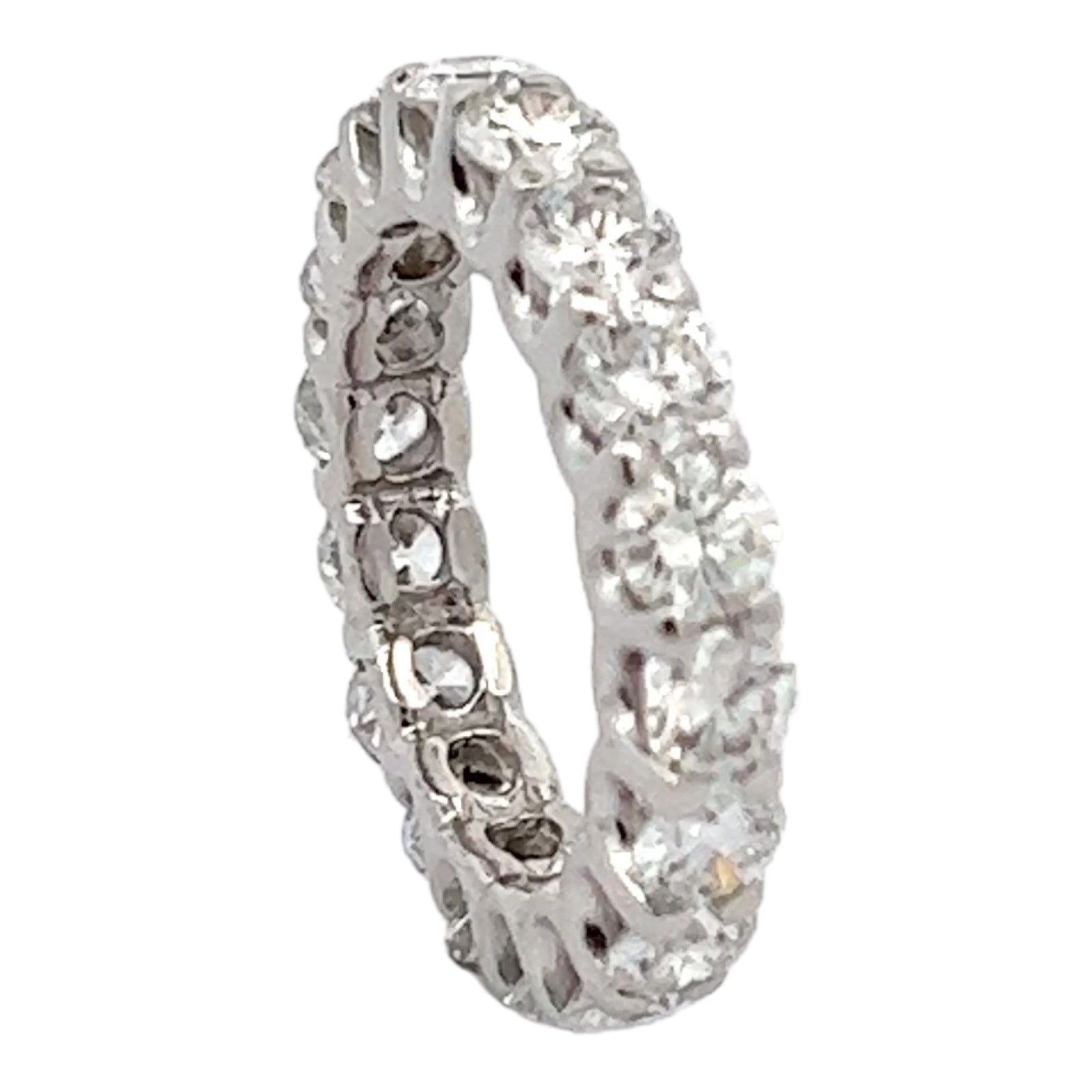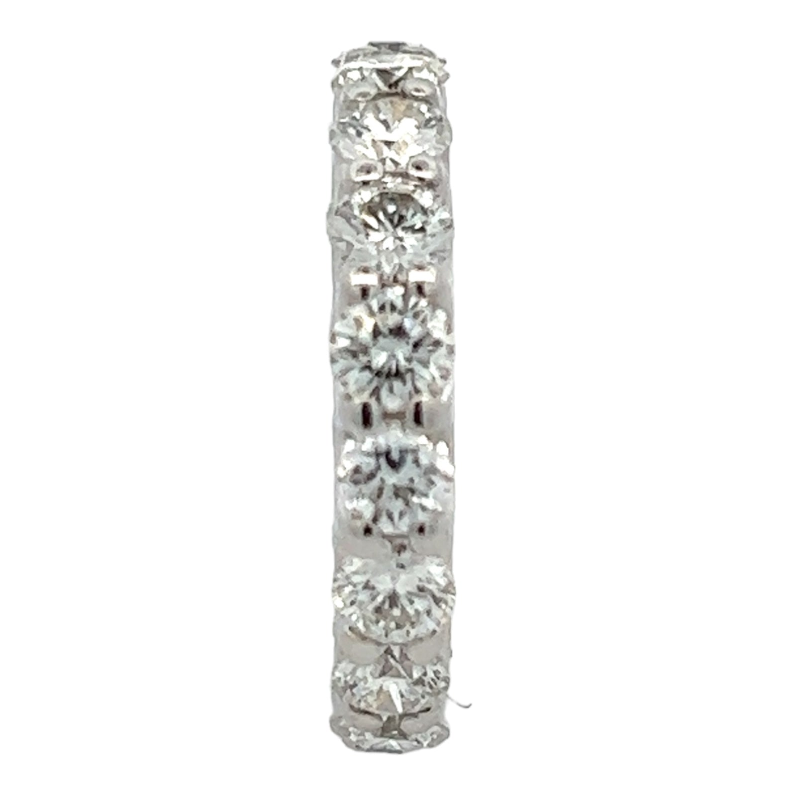 Beautiful diamond eternity wedding band handcrafted in 18 karat white gold. The band features 18 round brilliant cut diamonds weighing approximately 2.70 carat total weight and graded F-G color and VS2-SI1 clarity. The ring is size 3.75. Weight: 3.9 grams