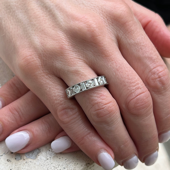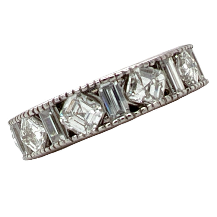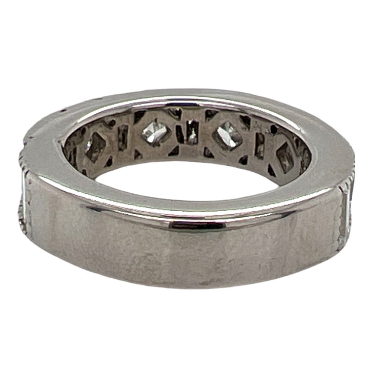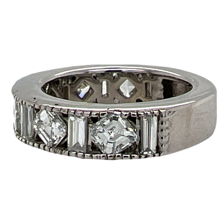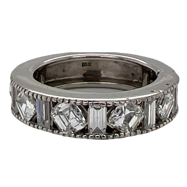 Fabulous diamond band handcrafted with milgrain edging in 18 karat white gold. The band features 6 square emerald cut diamonds weighing approximately 2.40 CTW and 7 baguettes weighing approximately 1.00 CTW (3.40 CTW). The diamonds are graded G-H color and VS clarity. The band measures 5.5mm in width, and is currently size 6 (small adjustments in size can be made).