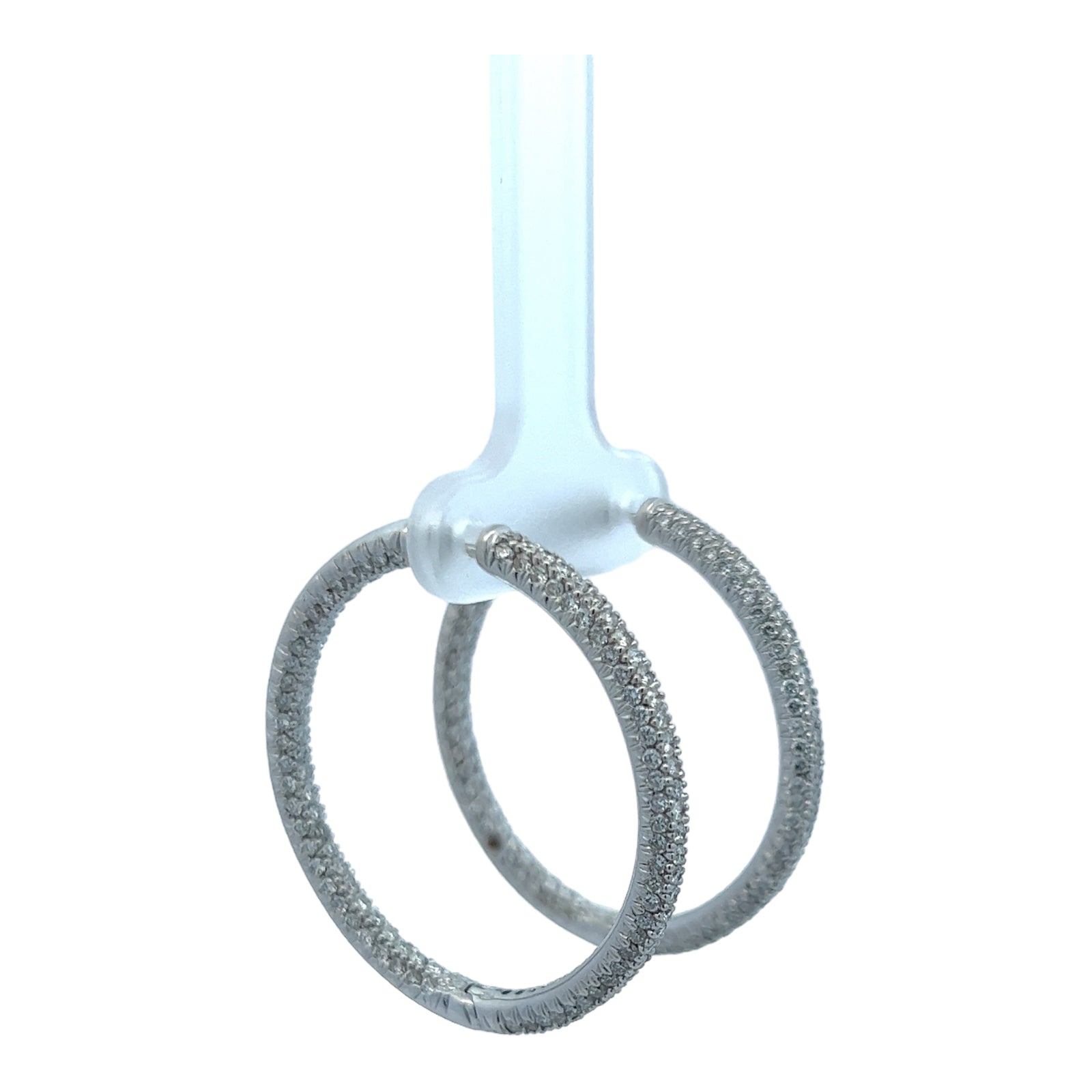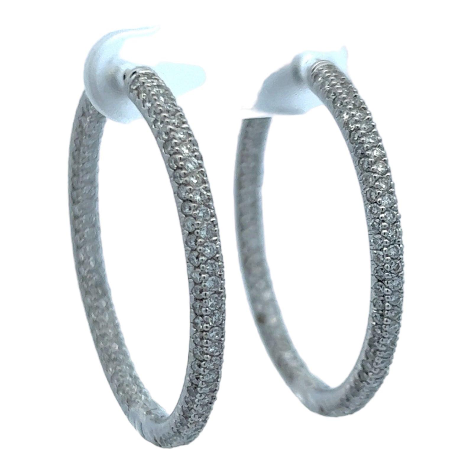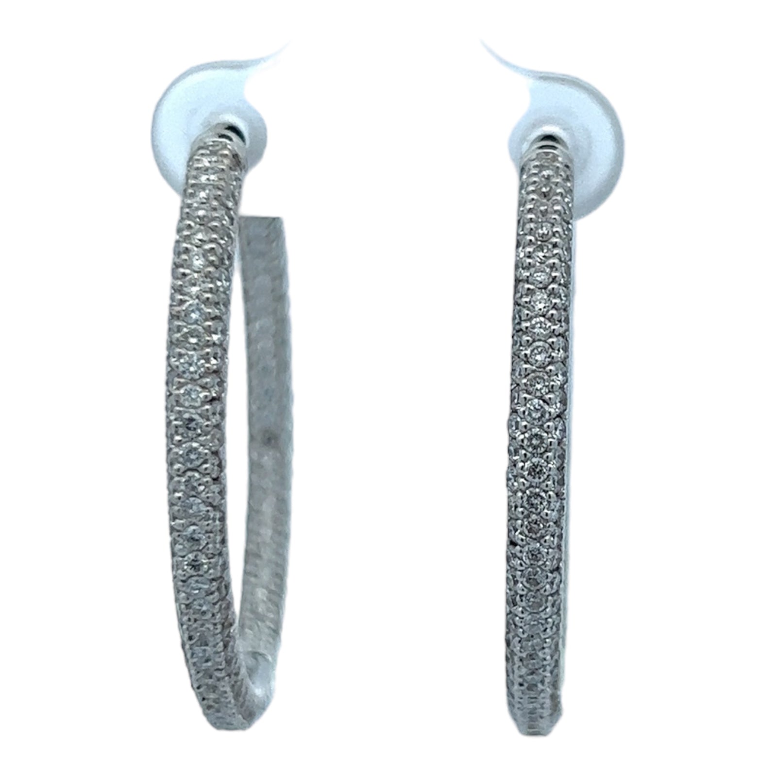 Modern diamond in & out hoop earrings crafted in 18 karat white gold. The hoops feature 3 rows of 362 round briliant cut diamonds weighing approximately 3.62 CTW and Graded H-I color and SI clarity. The 3mm hoops measure 1.25 inches in diameter.