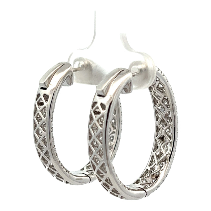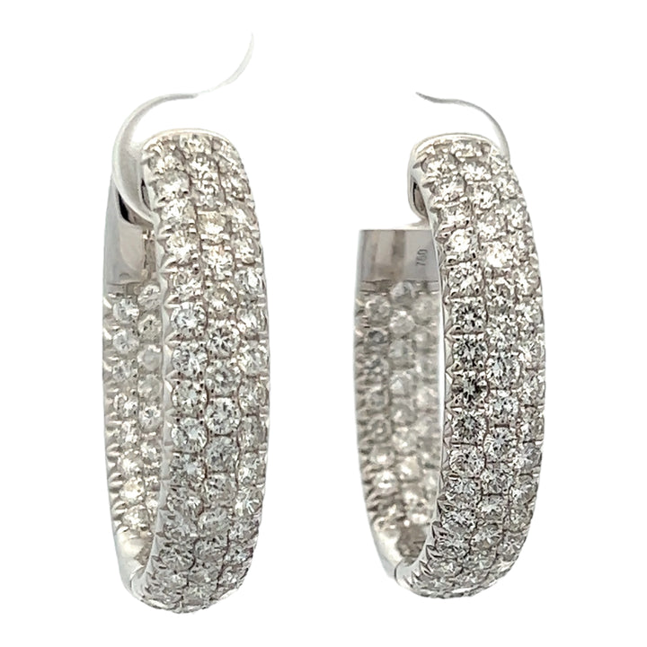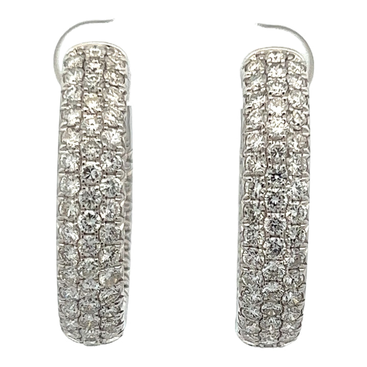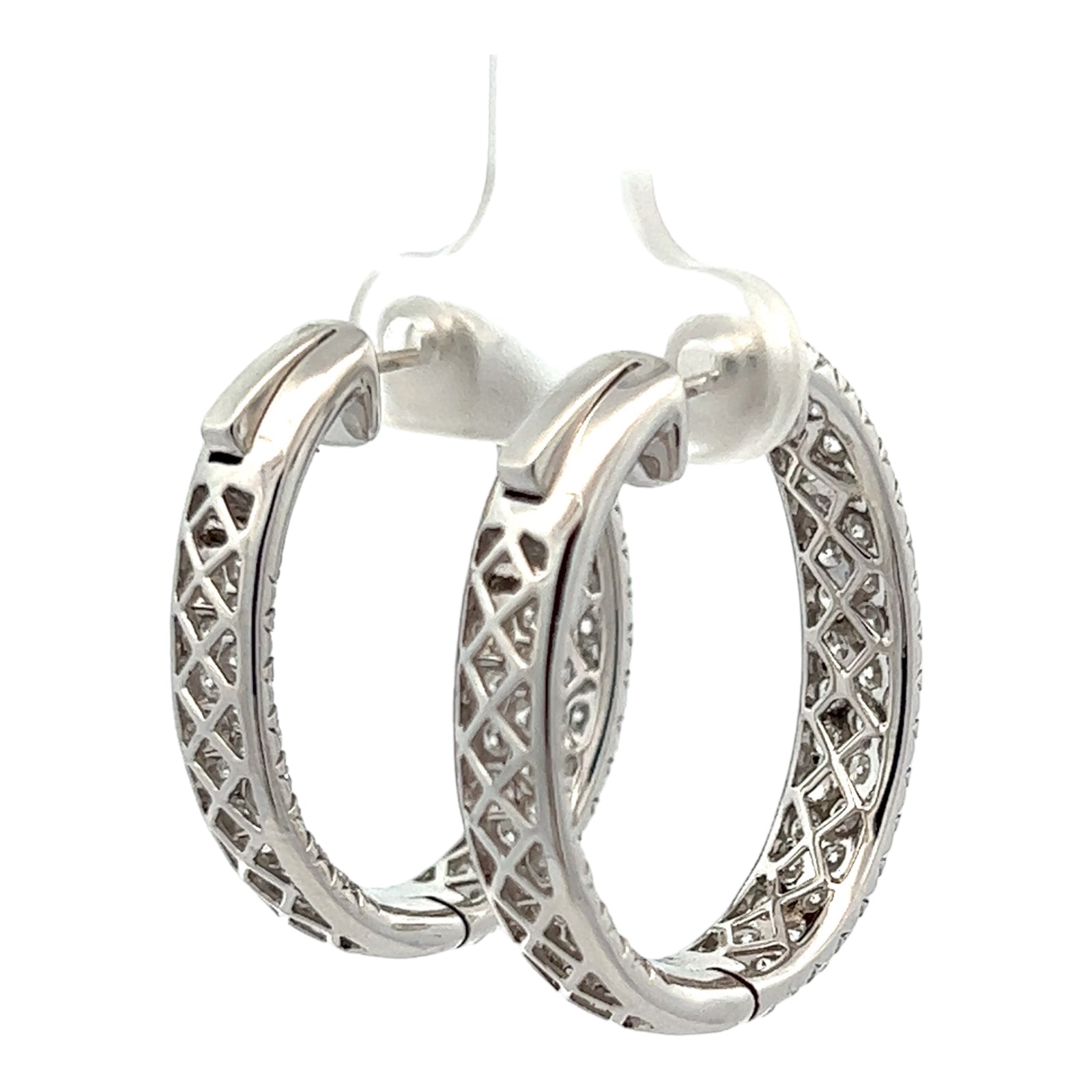 Modern brilliant diamond hoop earrings crafted in 18 karat white gold. The earrings feature round brilliant cut diamonds weighing 4.60 carat total weight and graded G-H color and VS clarity. The diamonds are set in an in & out configuration so you see diamonds however you move. The earrings measure 1.00 inch in length and .25 inches in width. Comfortable to wear for long periods of time.