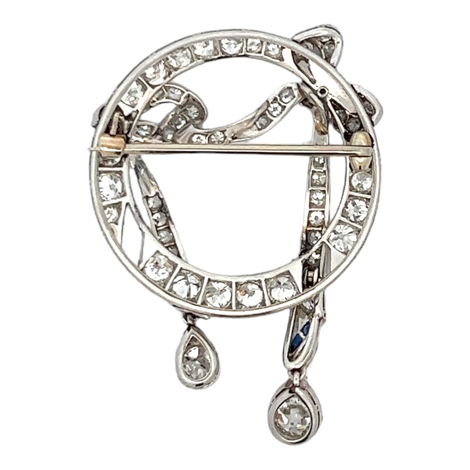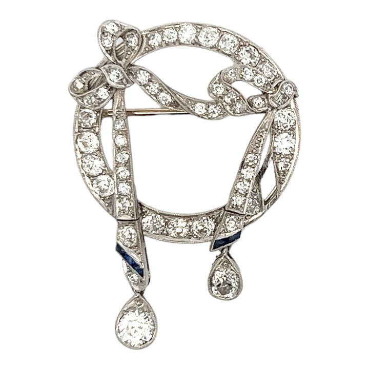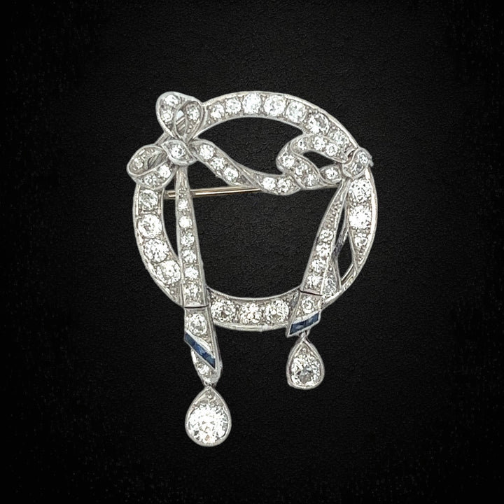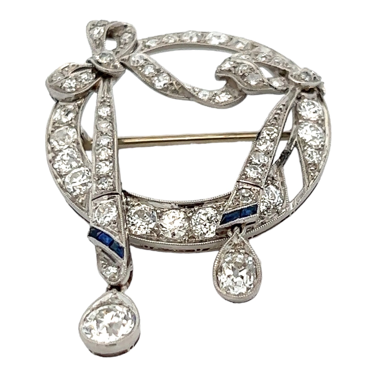 Original Art Deco diamond sapphire bow brooch handcrafted in platinum. The brooch features 2 Old European cut diamond drops weighing approximately 1.00 carat total weight and another 52 old Europan cut diamonds weighing approximately 3.50 carat total weight (4.50 CTW). The diamonds are graded H-I color and SI clarity. The round brooch with bow design measures 30 x 30mm and the drop 15mm.