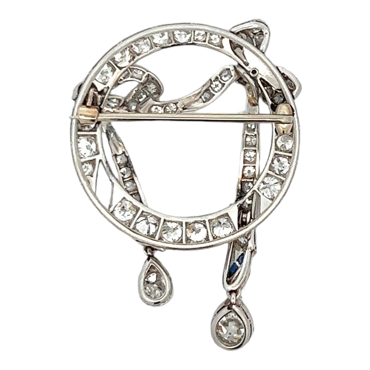 Art Deco Diamond Sapphire Platinum Bow Design Drop Brooch