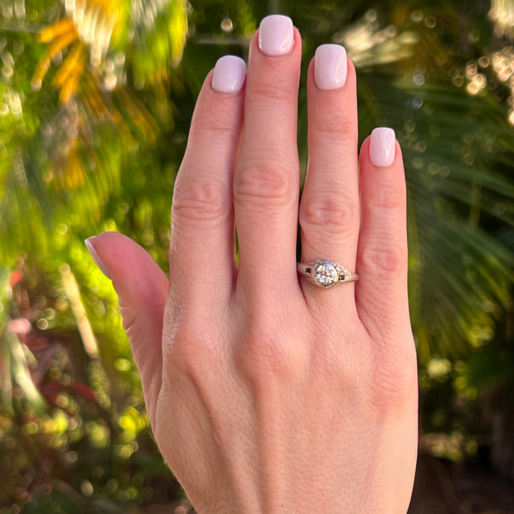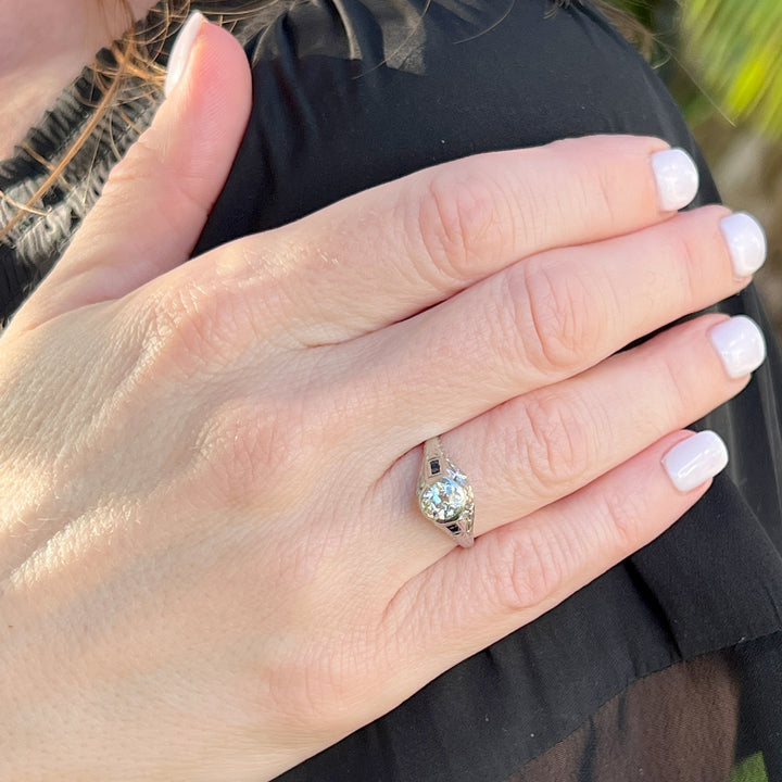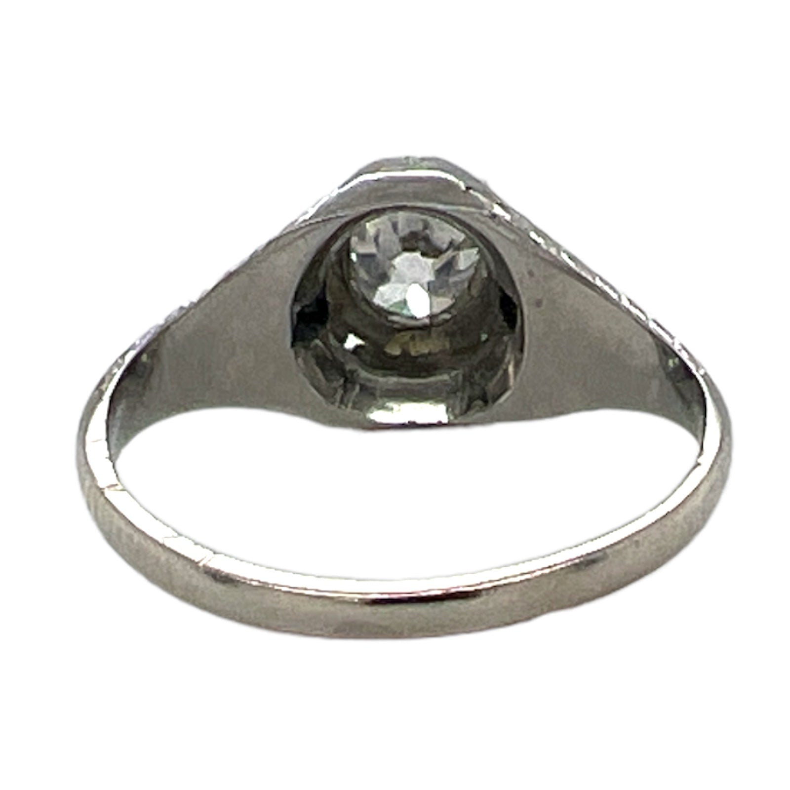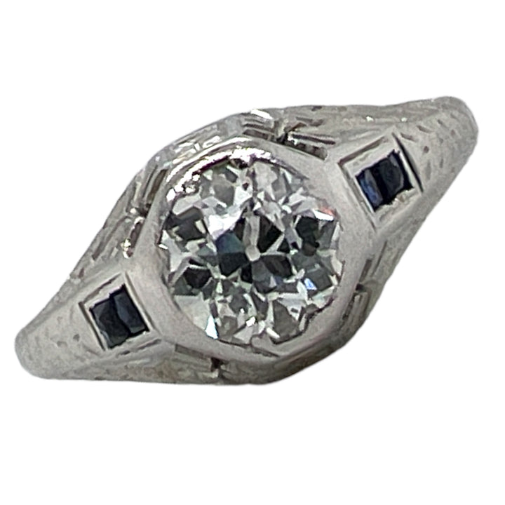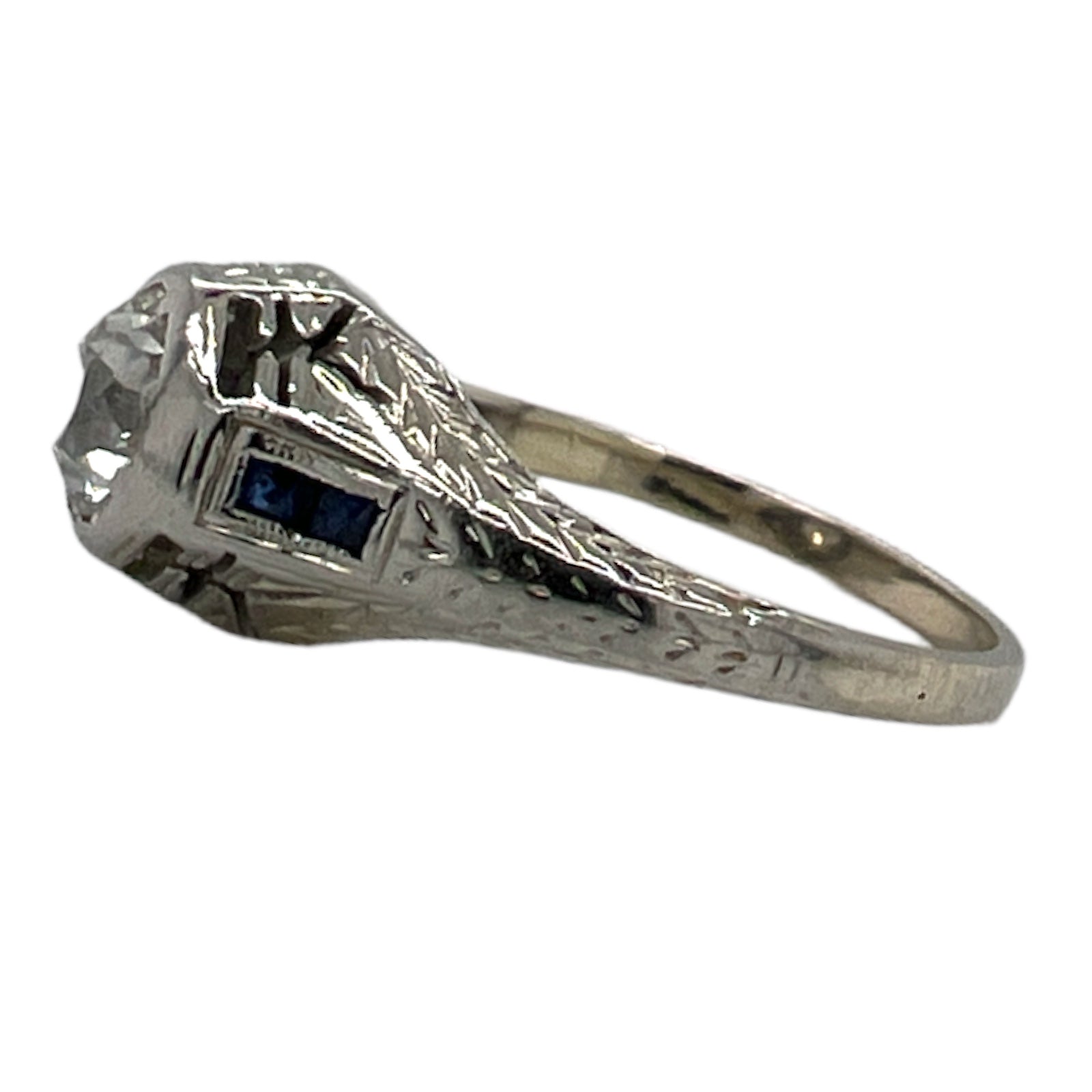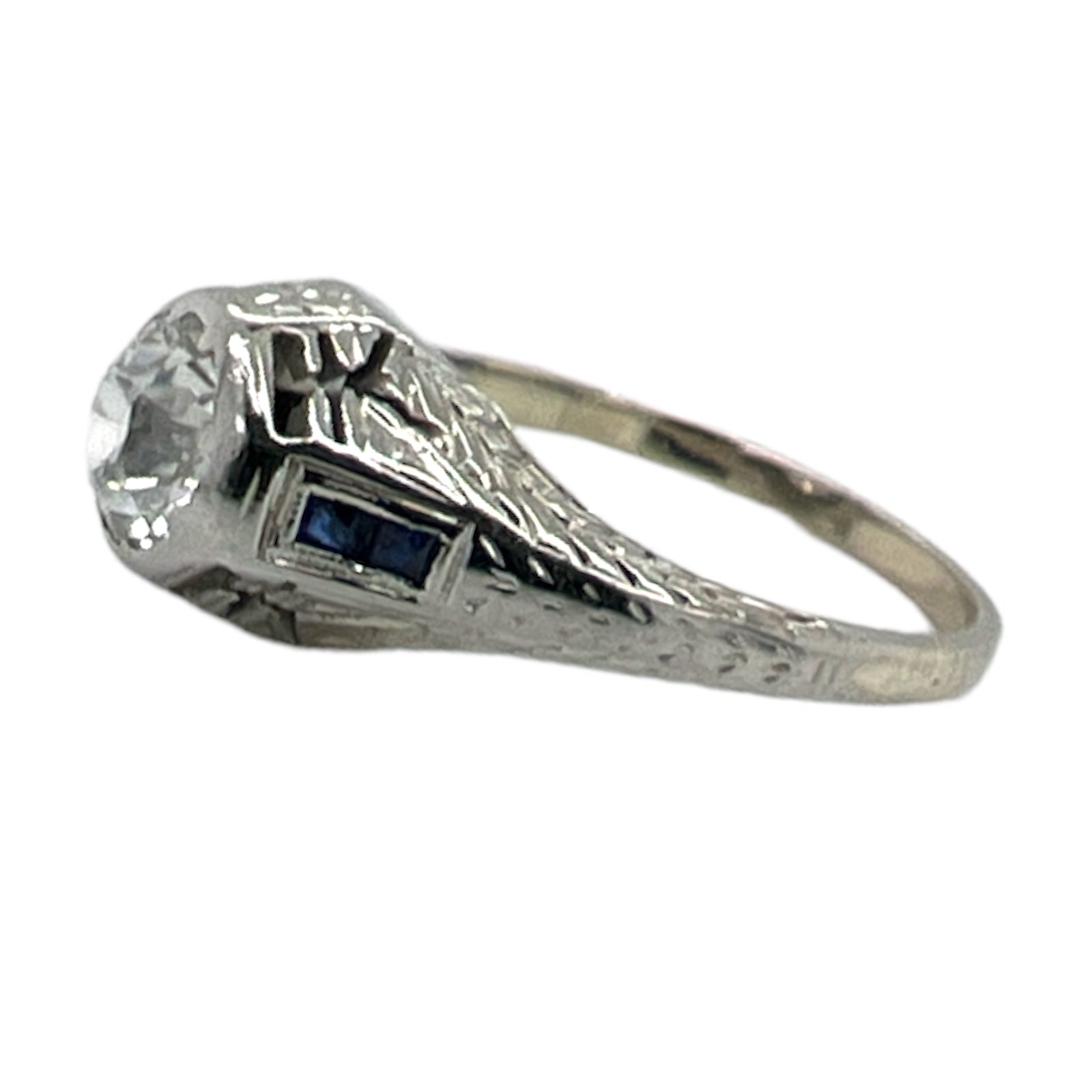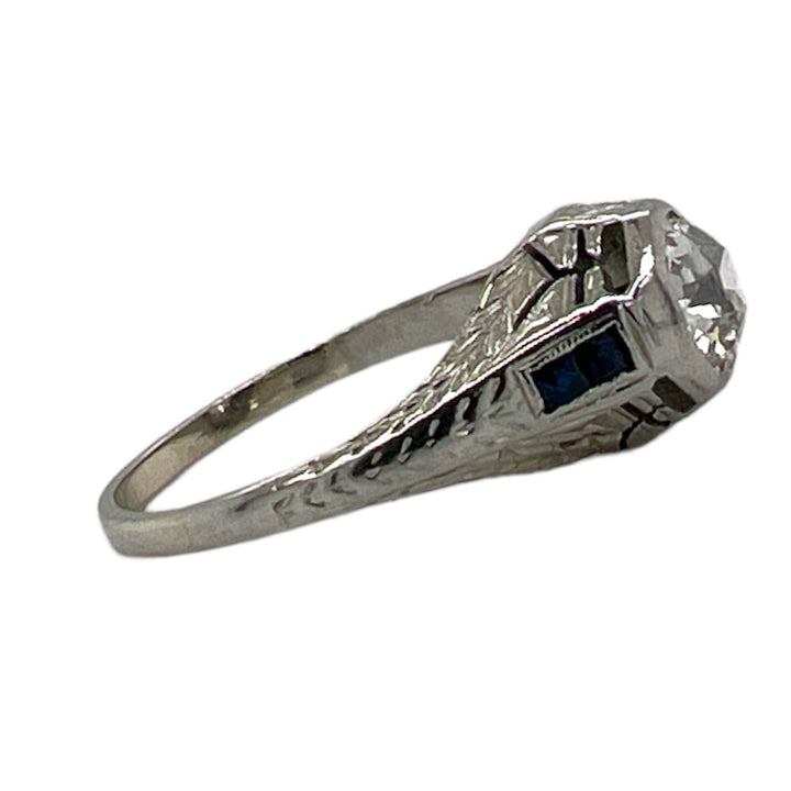 Original Art Deco diamond engagement ring handcrafted in platinum. The ring features an approximately .70 carat Old European cut diamond graded H color and VS clarity. The diamond is surrounded by 4 blue sapphire accents. The ring is currently size 6 (can be sized), amd measures 8mm in width.