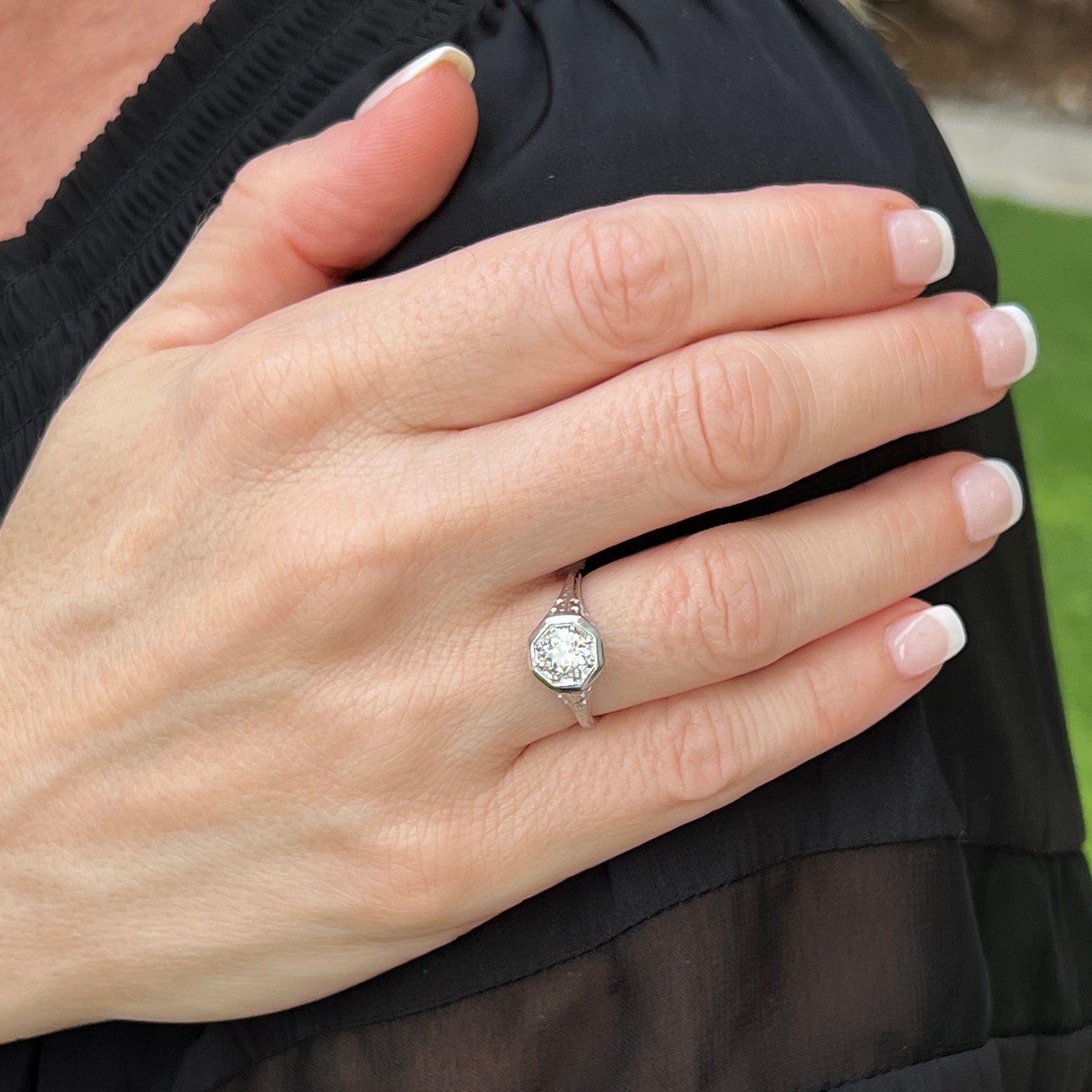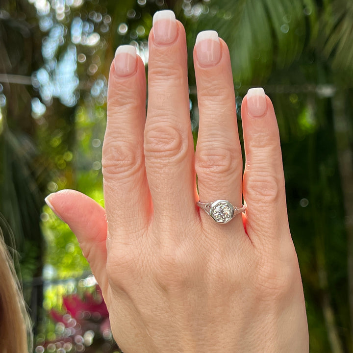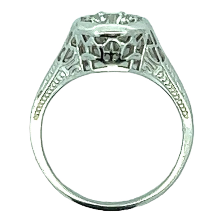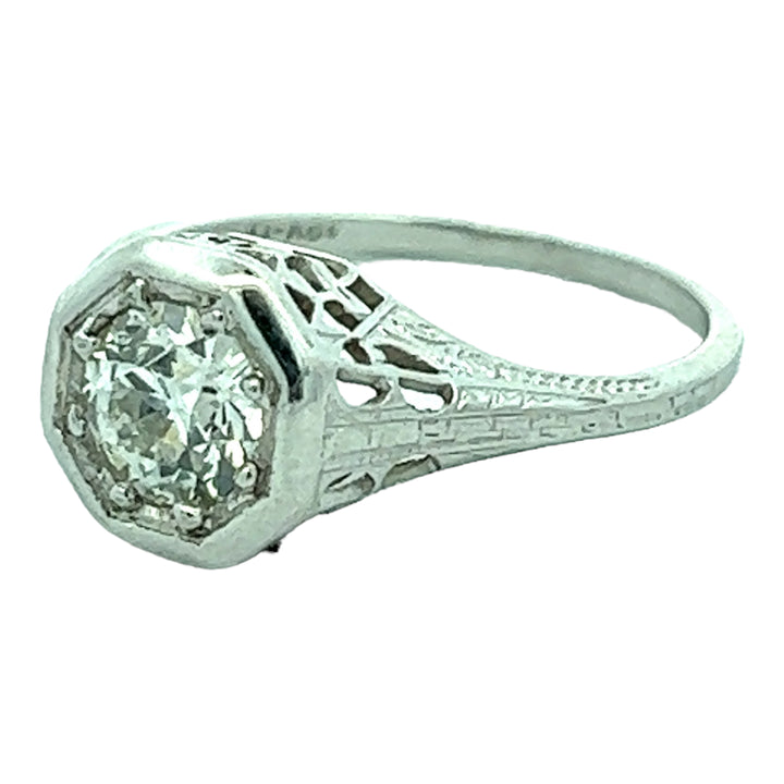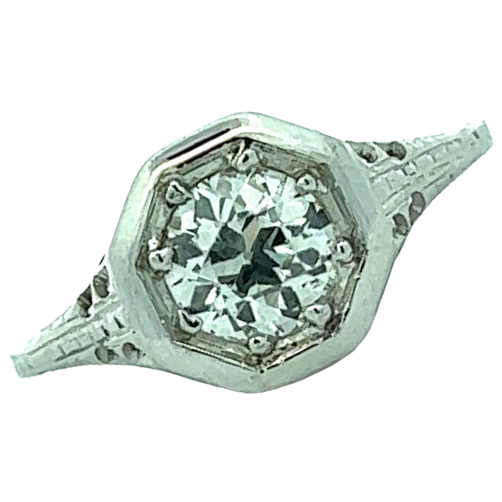Original Art Deco Diamond Engagement Ring handcrafted in 18 karat white gold. The Old European cut diamond weighs approximately .70 carats and is graded H color and SI1 clarity. The filigree octagonal mounting measures 8.5mm in width and is currently size 5.25 (can be sized).