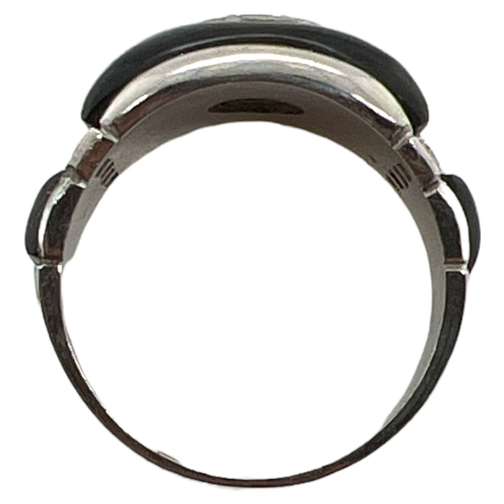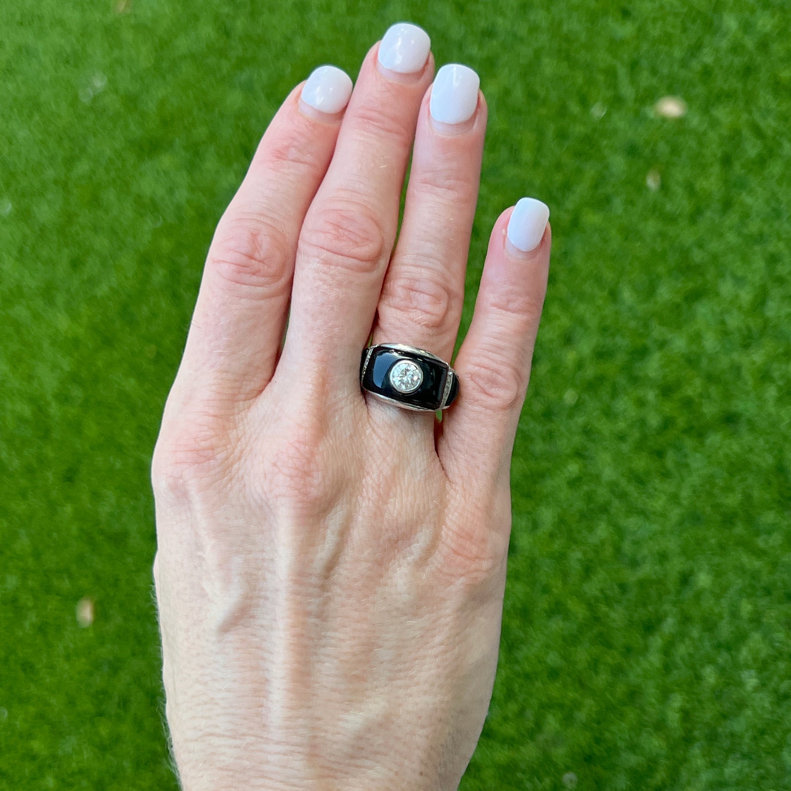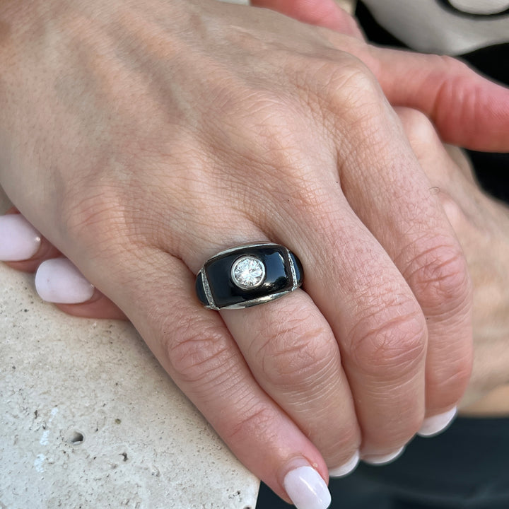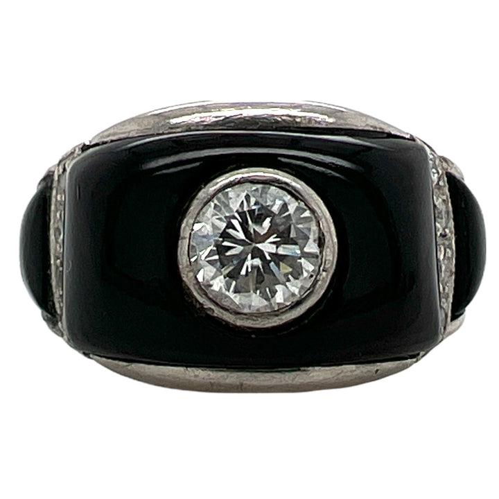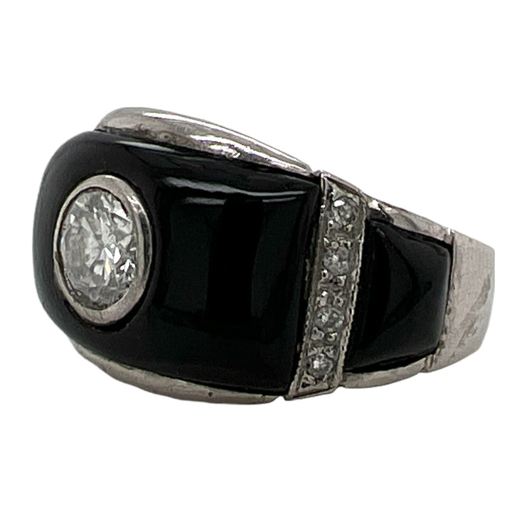 Beautiful Art Deco diamond and onyx cocktail ring handcrafted in platinum. The ring features a bezel set Old European cut diamond weighing approximately .60 carats, and another 8 side diamonds weighing another .12 carats. The diamonds are graded F-G color and SI1 clarity. The ring graduates measuring 3.5- 12.3mm in width, and is currently size 7 (can be sized).