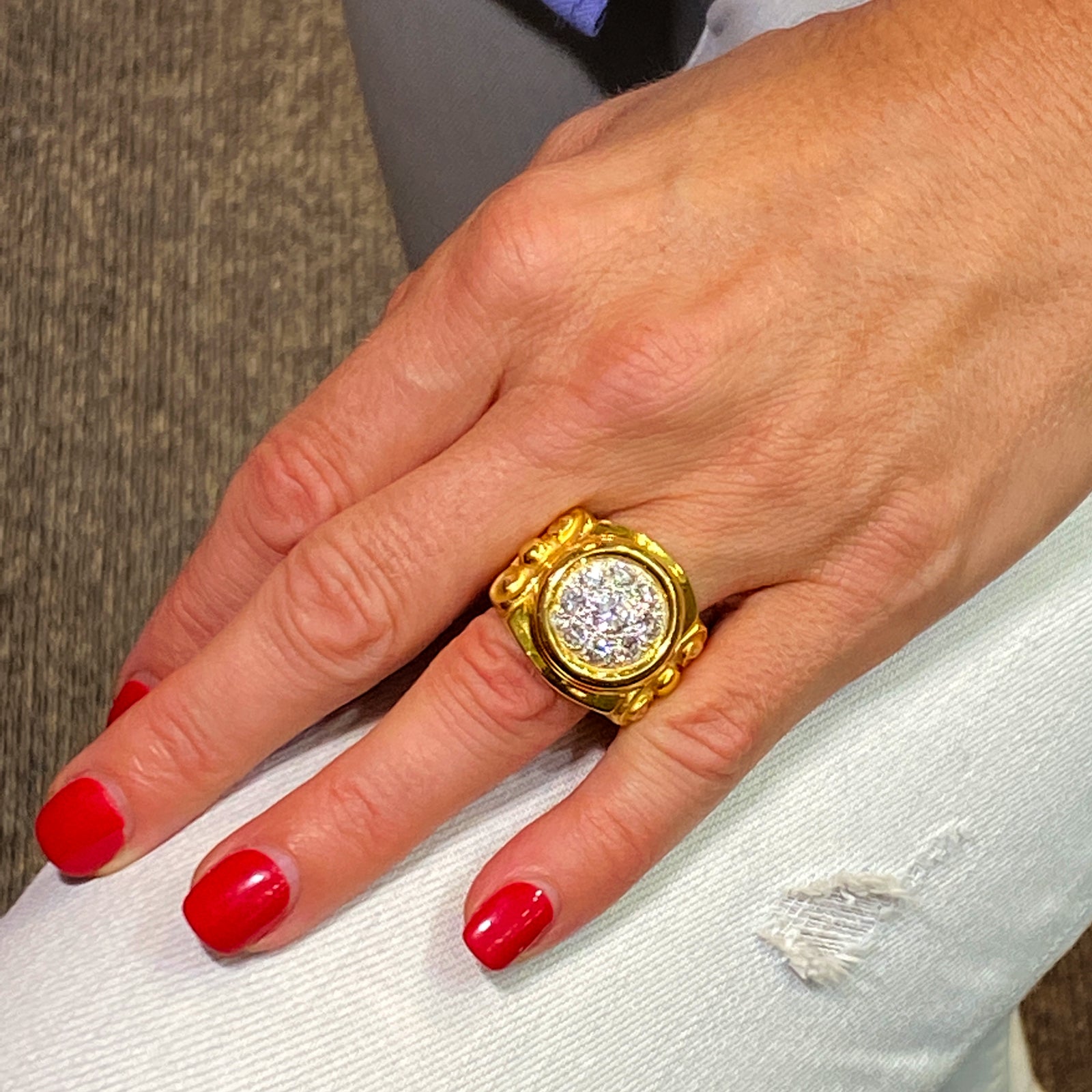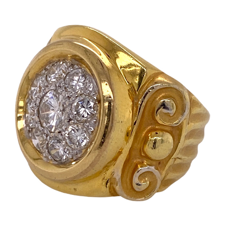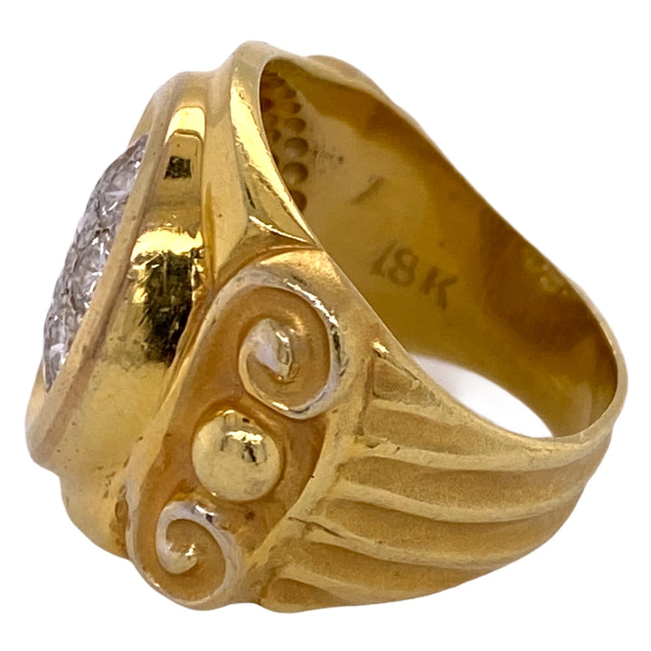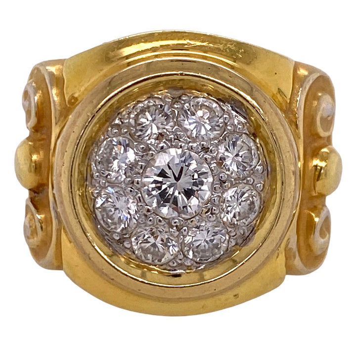 Pave diamond Etruscan Style ring fashioned in 18 karat yellow gold. The ring features a center diamond weighing approximately .54 carats and another 8 diamonds weighing 1.60 carats (2.15 CTW). The diamonds are graded H-I color and SI1 clarity. The ring is measures 20mm in width and is currently size 9 (can be sized).
