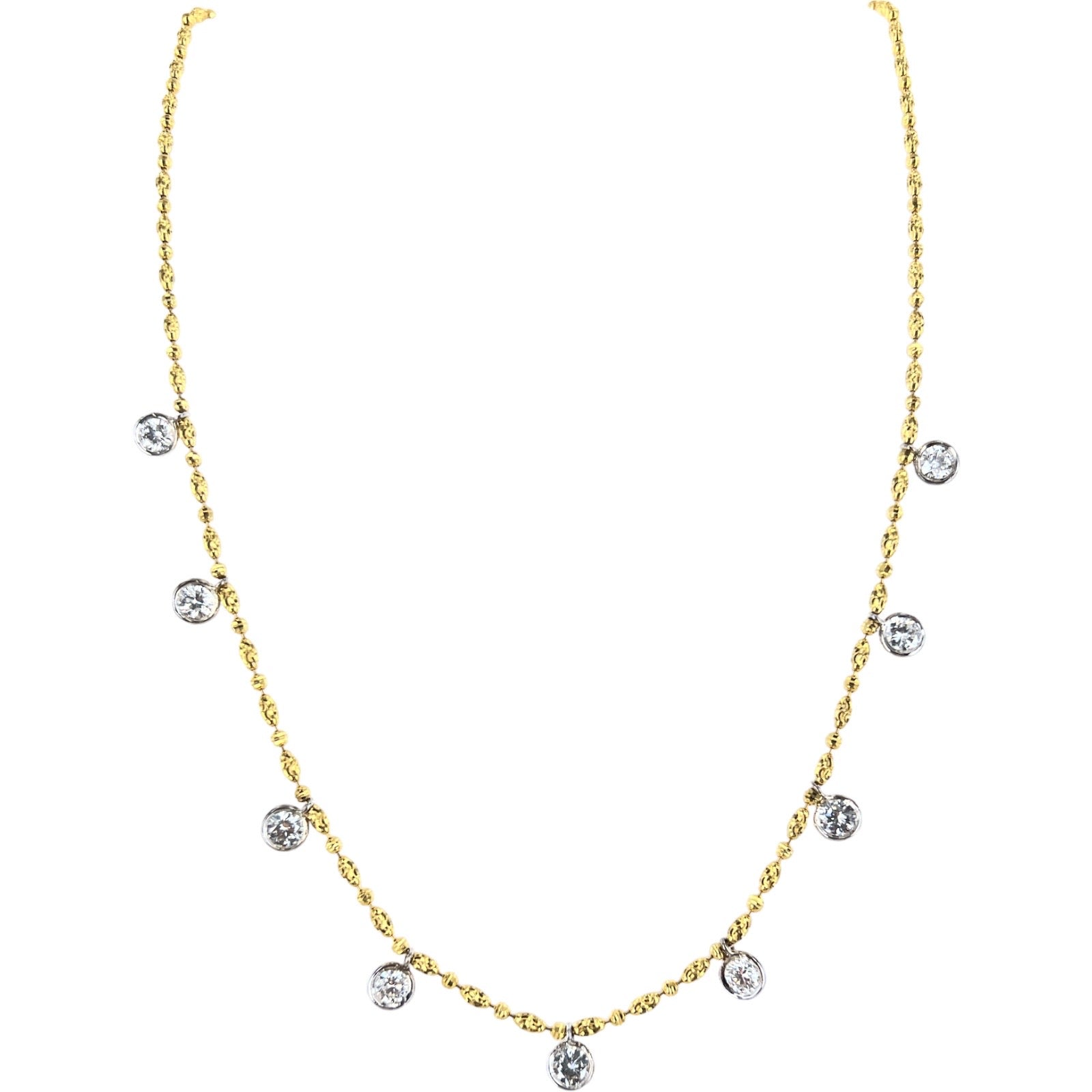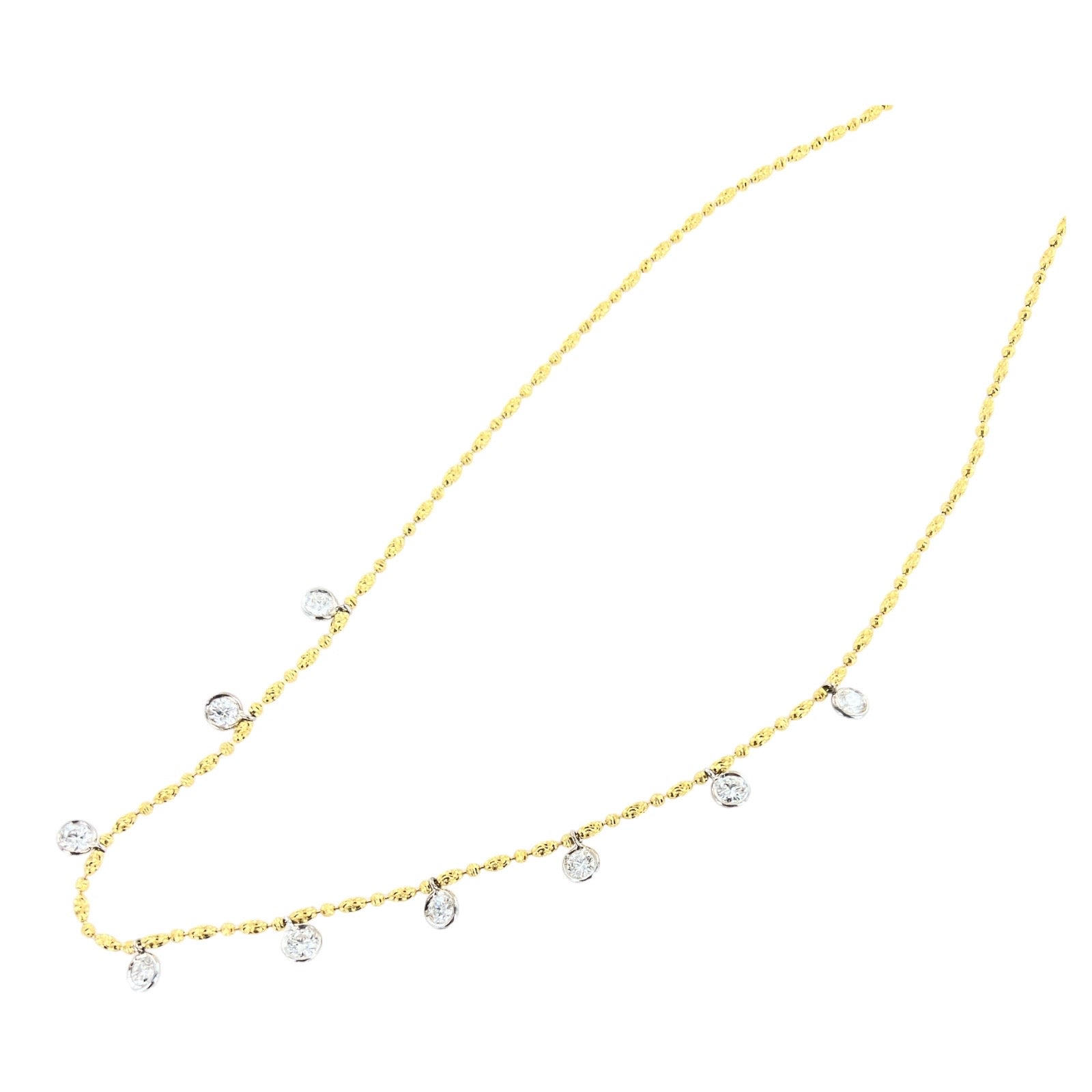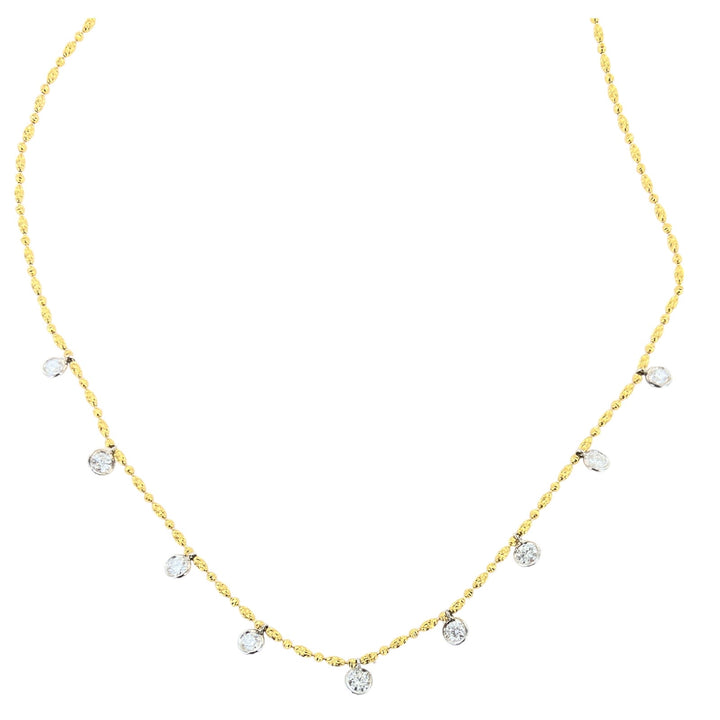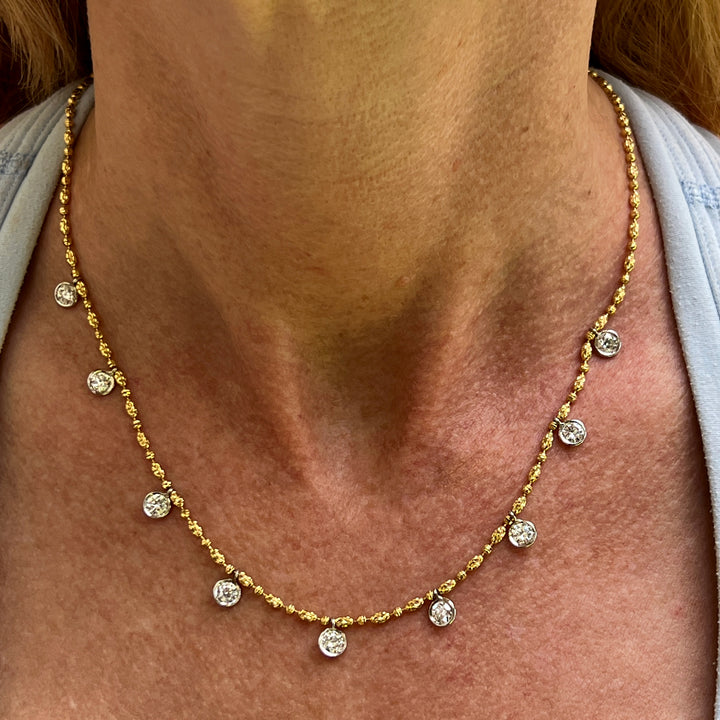 Modern diamond drop necklace crafted in 14 karat yellow and white gold. The necklace features 9 round brilliant cut diamond drops bezel set in white gold. The diamonds weigh 2.35 CTW and are graded G-H color and VS2- SI1 clarity. The diamond cut yellow gold chain measures 18 inches in length with lobster clasp.