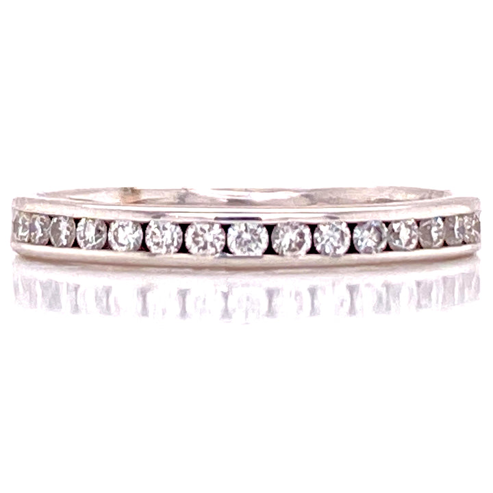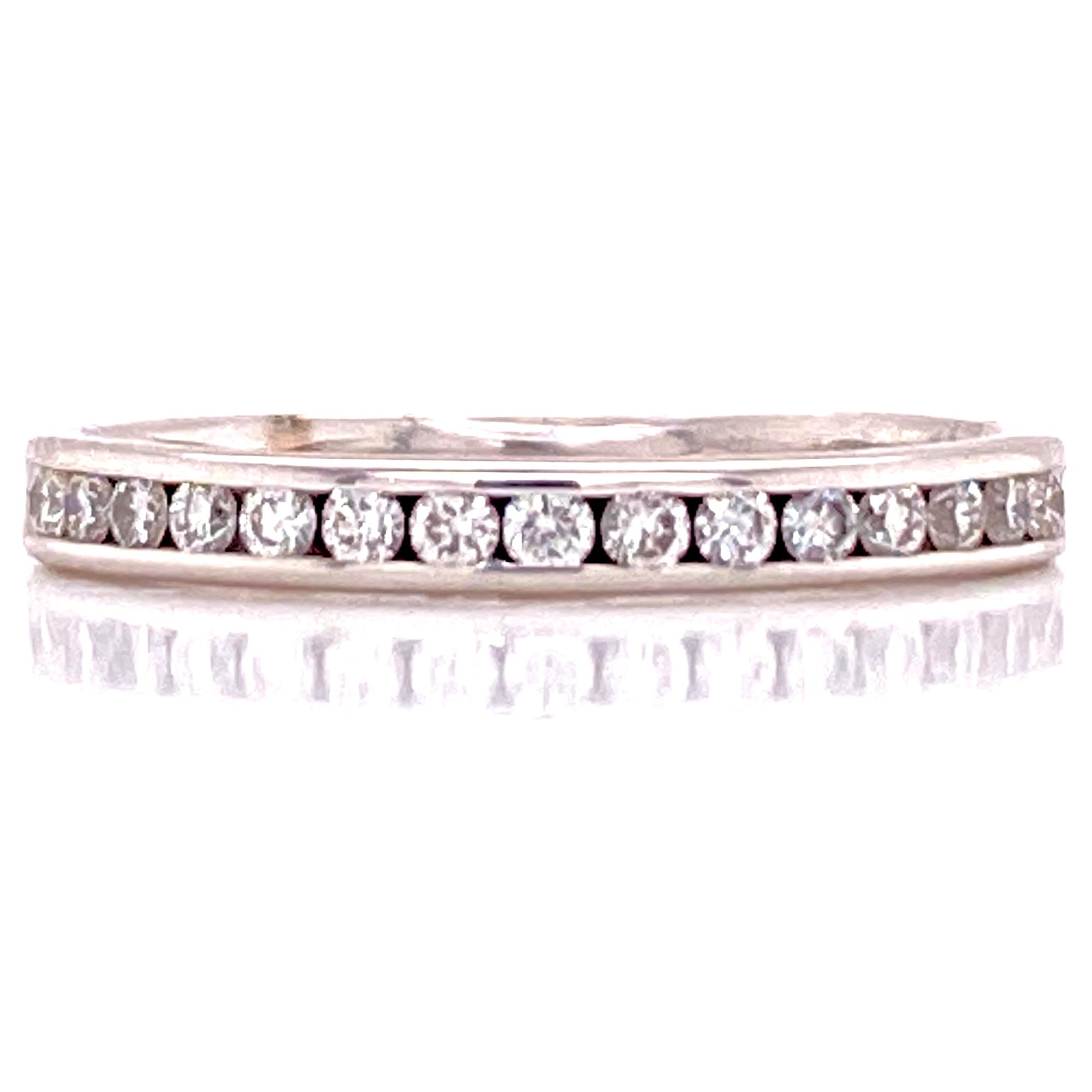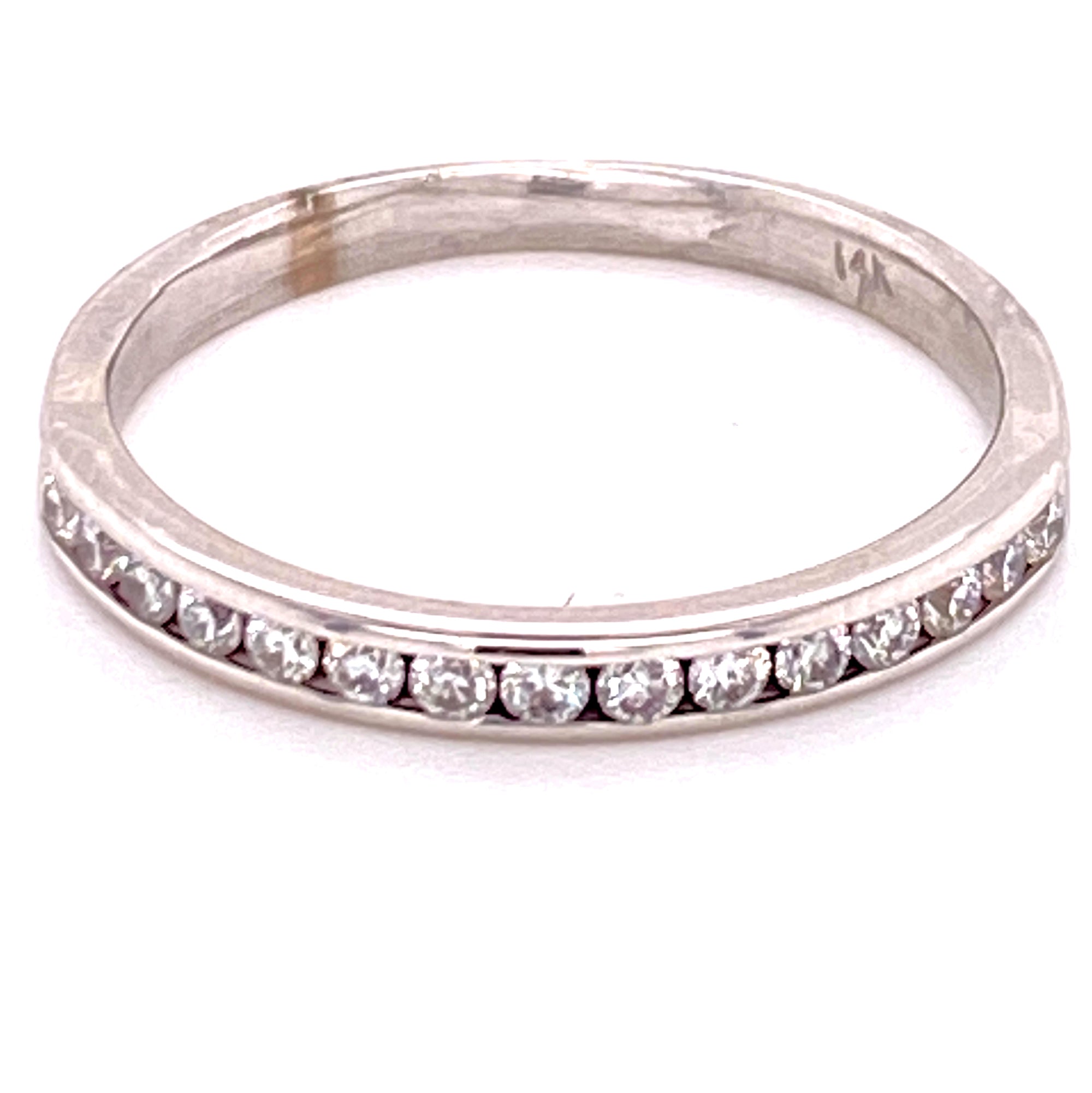 Diamond wedding band fashioned in 14 karat white gold. The 15 channel set round brilliant cut diamonds weigh .30 carat total weight. The diamonds are graded G-H color and VS2-SI1 clarity. The band is size 6.5 (can be sized).