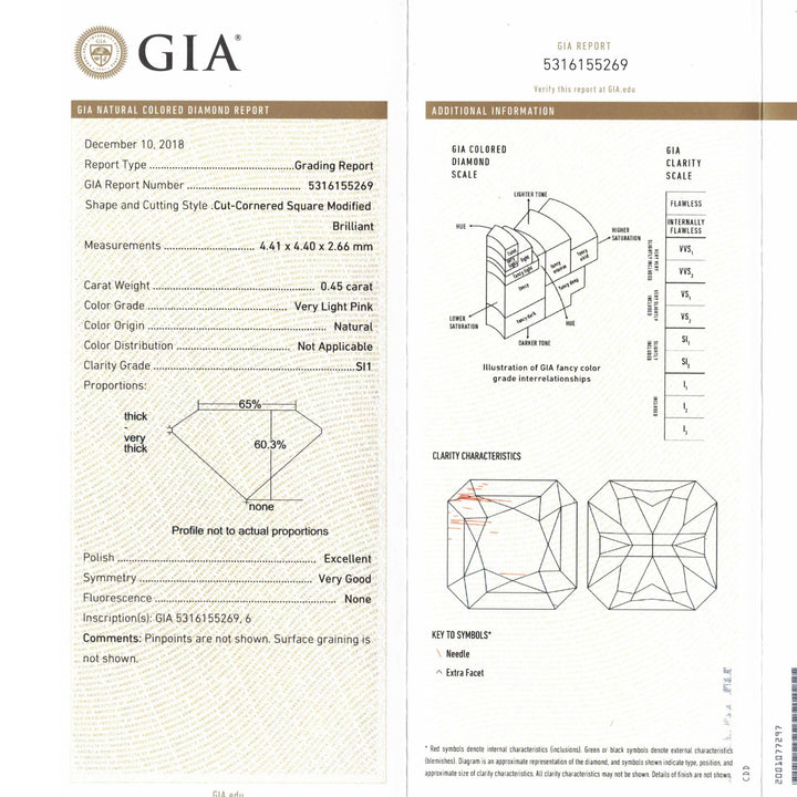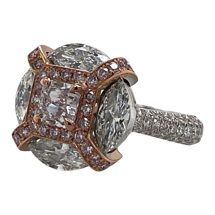 Fabulous natural pink diamond engagement ring fashioned in 18 karat white and rose gold. The ring features a .45 carat radiant cut natural light pink diamond graded by the GIA VLP/SI1 (see report in the photos section). The pink diamond is surrounded by 4 marquise shape white diamonds weighing 1.28 CTW and graded G-H color and VS clarity, and another 36 natural pink diamonds and 62 white diamonds weigh another .95 CTW. The ring is currently size 6.5 (can be sized), and the top measures 13.5mm in diameter.