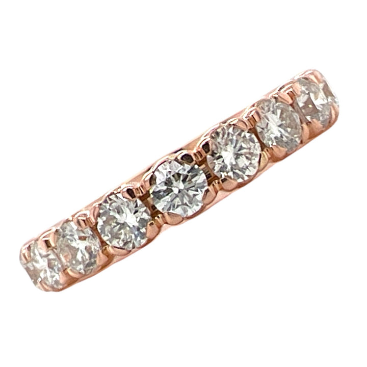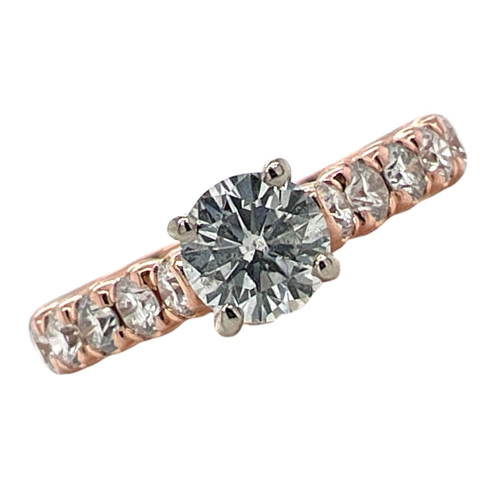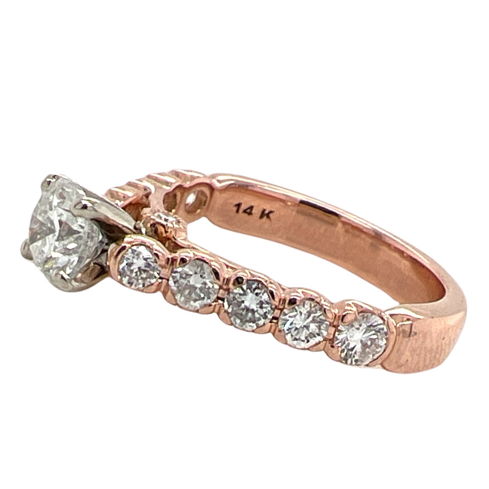 Beautiful bridal set designed by Shane & Co. fashioned in 14 karat rose gold. The ring features a .70 carat round brilliant diamond engagement ring graded I color and I1 clarity. The ring also features round brilliant cut diamonds on the shank and matching diamond band. Altogether, there are 19 side diamonds weighing 1.75 carat total weight and graded I color and SI clarity. The set is currently size 6.5, but can be sized. The bands measure 3.5mm in width.